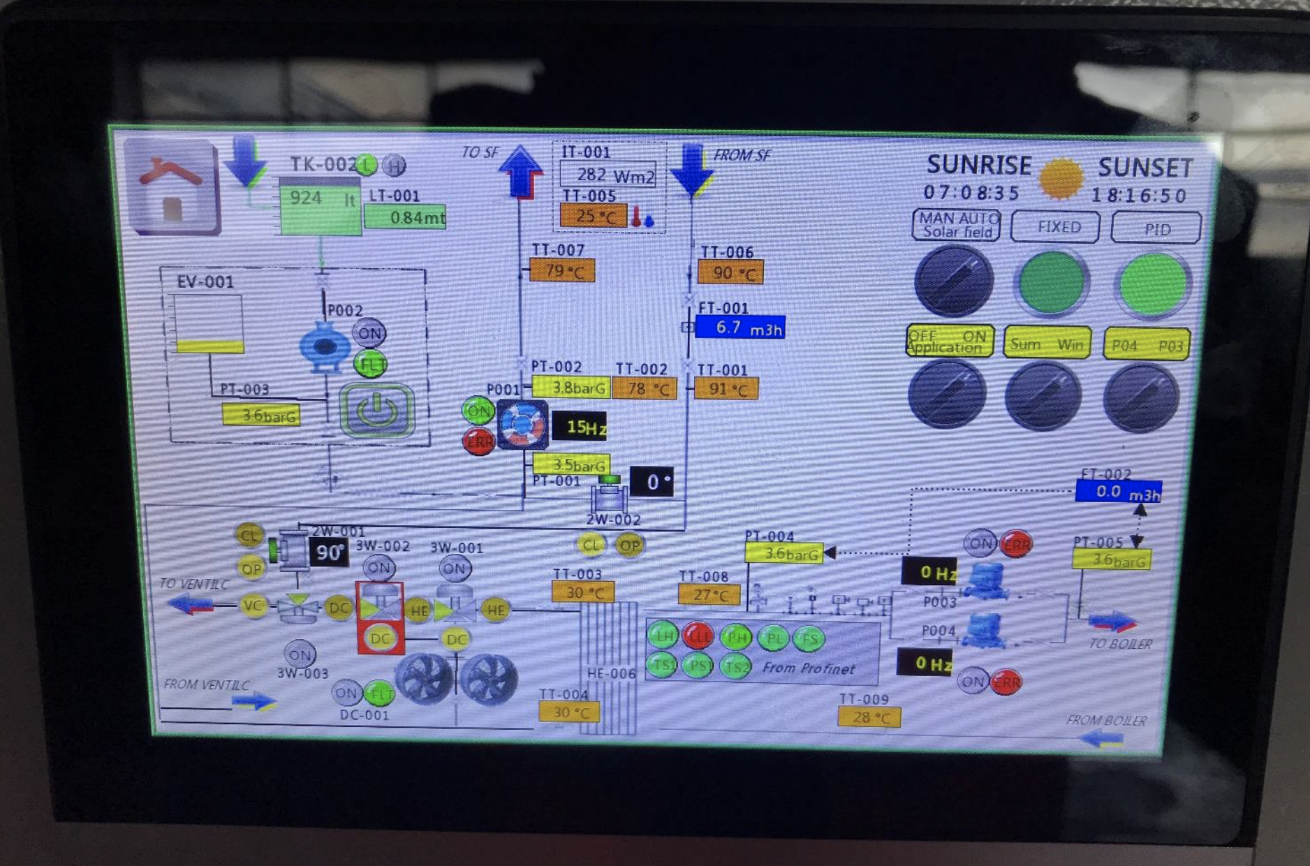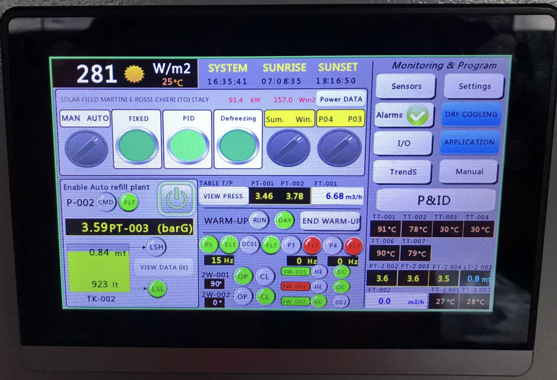 First, detailed checks were carried out on the operating status of the main instruments linked to the protection equipment of the solar field. The electronic connection and the consequent mechanical/electrical activation of the main valves were verified through changes to the operating settings of the PLC (Programmable Logic Controller).